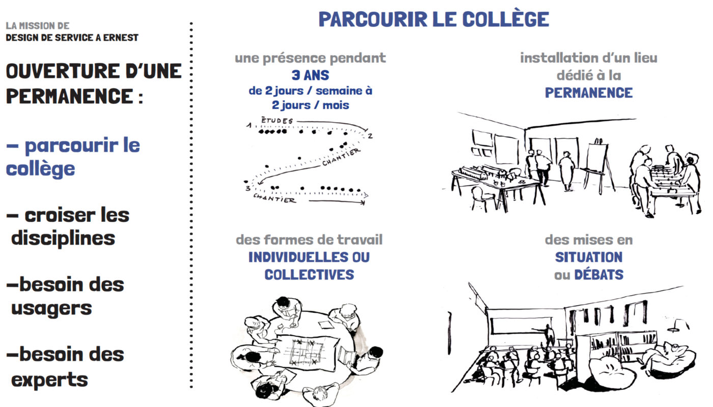 Pour le département, il s’agit de reconstruire le collège Ernest Renan. Sa relocalisation est chargée d’un fort enjeu de mixité. Nous accompagnons la MO depuis la programmation du collège jusqu’à l’appropriation de celui-ci par les usagers. Cinq ans de mission d’AMU pour déployer une forte médiation avec les usagers et être les garants de leurs besoins. Tour à tour AMO pour le département puis bureau d’étude au sein de l’équipe de maitrise d’œuvre, notre travail a consisté à faire émerger des nuances d’usage dans les différentes phases de conception puis de facilier l’appropriation et le déménagement des équipes d’un collège à l’autre.